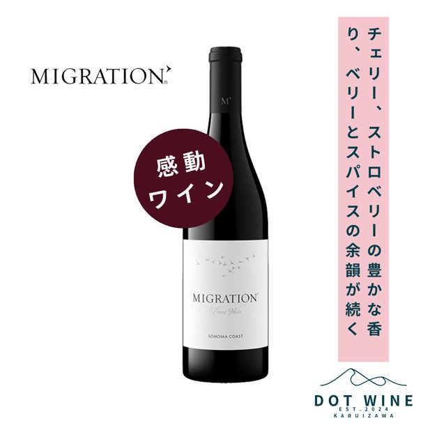 ピノ・ノワール ソノマ・コースト / マイグレーション (Pinot Noir Sonoma Coast / Migration (Duckhorn Portfolio)) 750ml 赤ワイン ピノ・ノワール / 凝縮感のある赤系果実、チェリー、杉、そして森林の下草の香り / 口に含むと、より華やかさと深みが増す / バニラやフレンチオークのニュアンス / ベリーとスパイスの余韻が心地よい