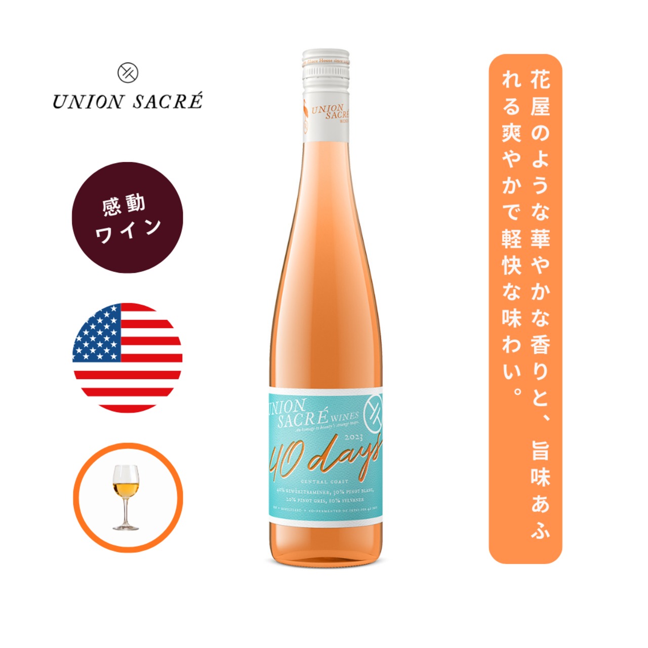 ユニオン・サクレ ワインズ 40デイズ・オレンジ / ユニオン サクレ ワインズ ( UNION SACRE WINES 40days Orange / UNION SACRE WINES ) 750ml オレンジワイン ゲヴゥルツトラミネール / 花屋ような華やかな香り / とても爽やか / 軽やかな口当たり / 旨味あふれる